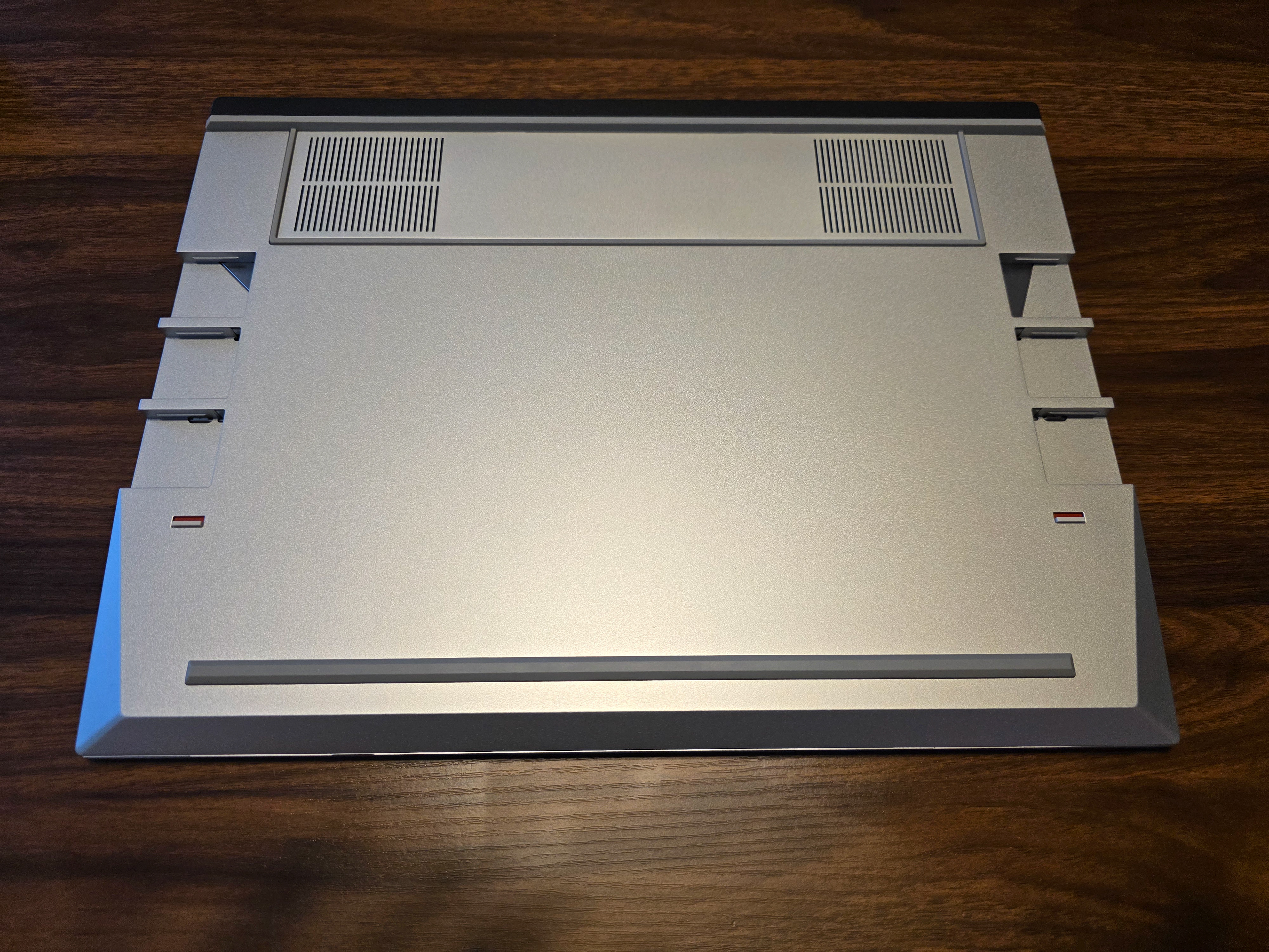 After setting aside the components on top I got to see, and pick up the main laptop chassis. On the first pick up the heft certainly surprised me. I knew that it was made out of metal, primarily aluminum from my understanding, but it was certainly more hefty than I had imagined. With the heft though, it also felt very solid in my hands as well. Opening the laptop up reveals the screen, touchpad, and mid plate. The mid plate covers the main processor and where you’ll install your RAM and storage.