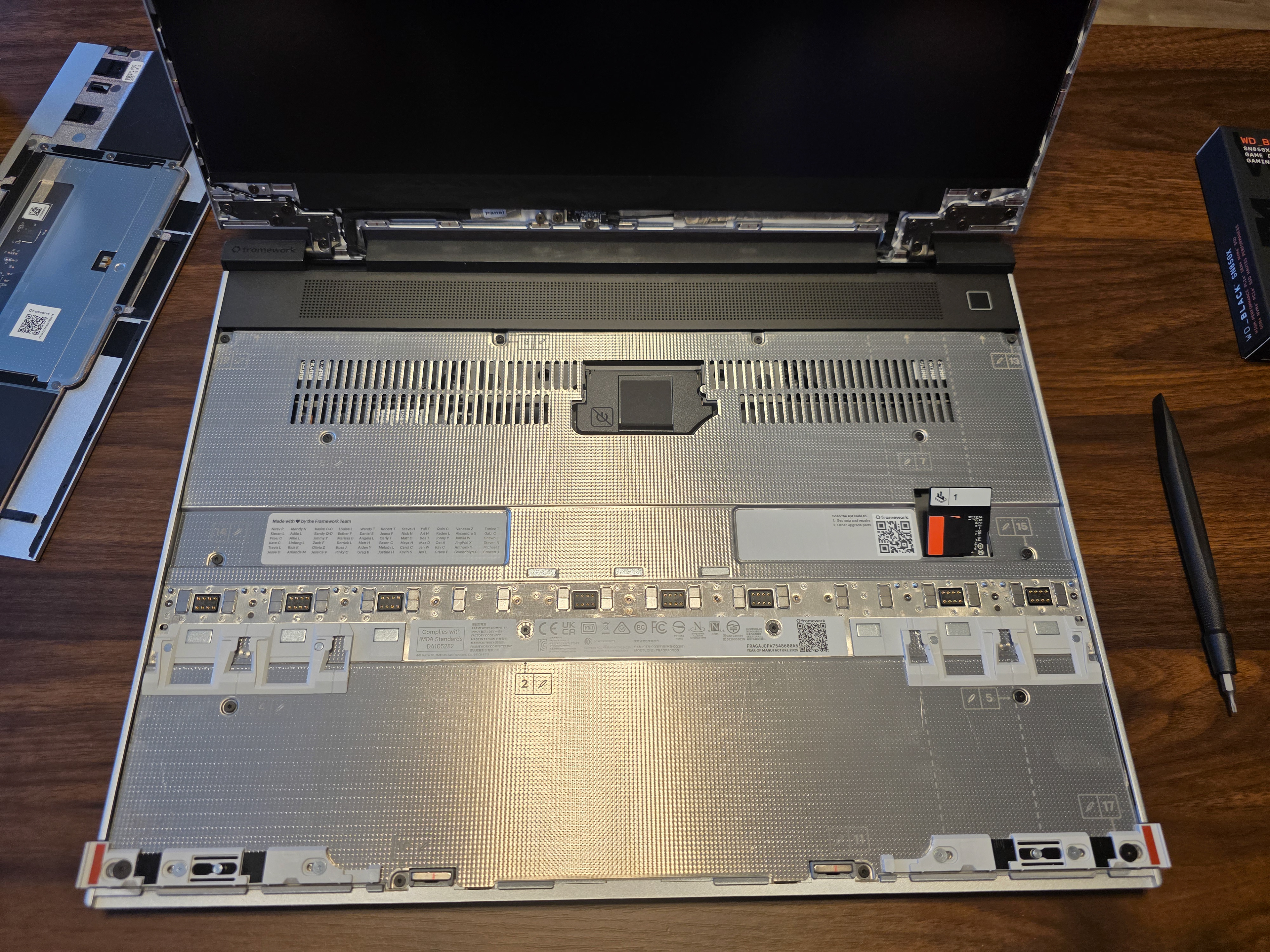 After removing the mid plate, and the touchpad there were clear and easy to identify locations to install your storage and RAM. I personally went with a 1TB drive and a single stick of 16GB on RAM. While I initially planned to go with 32GB of ram, the prices are just too high right now, and I decided it would be easy enough to upgrade later if I really needed the extra memory.